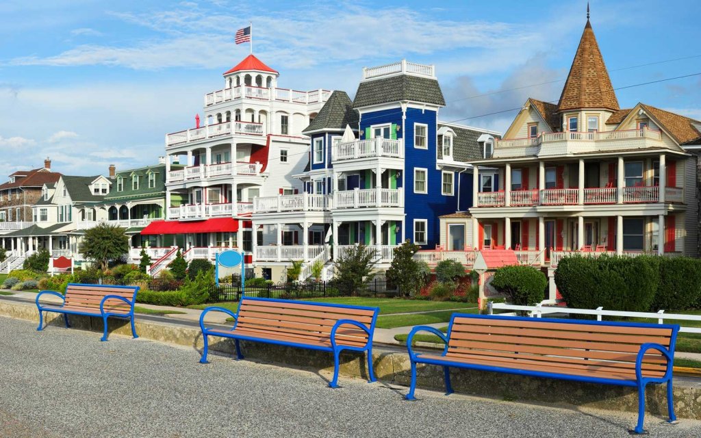 Victorian architecture along the promenade in the historic district of Cape May. Located at the southern tip of Cape May Peninsula, It is one of the country’s oldest vacation destinations. The entire city (population 3,600) is designated as the Cape May Historic District because of its concentration of Victorian buildings.
